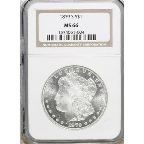 <B>1879-S $1 MS66 NGC.</B></I> . NGC Census: (5547/1783). PCGS Population (5698/1134). Mintage: 9,110,000. Numismedia Wsl. Price for NGC/PCGS coin in MS66: $240. (#7092)<BR><BR><B>Coin Engraver:</B> George T. Morgan<BR><BR><b>Shipping:</b> Coins & Currency (<a target="_blank" href="http://www.heritageauctions.com/common/shipping.php">view shipping information</a>)