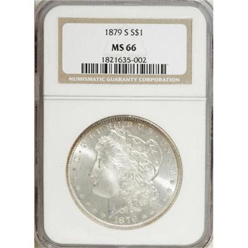 <B>1879-S $1 MS66 NGC.</B></I> . NGC Census: (5544/1782). PCGS Population (5698/1134). Mintage: 9,110,000. Numismedia Wsl. Price for NGC/PCGS coin in MS66: $240. (#7092)<BR><BR><B>Coin Engraver:</B> George T. Morgan<BR><BR><b>Shipping:</b> Coins & Currency (<a target="_blank" href="http://www.heritageauctions.com/common/shipping.php">view shipping information</a>)