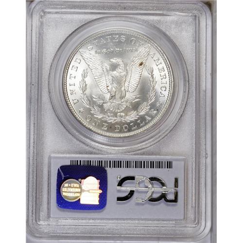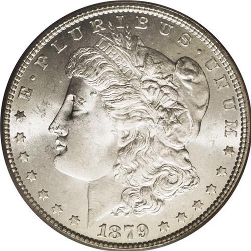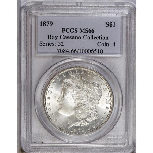 <B>1879<img border='0' src='http://www.heritagecoins.com/images/star.gif' width=10 height=10>$1> MS66 PCGS.</B></I> Ex: Ray Cassano Collection. This impressive Premium Gem is sharply struck and essentially brilliant with richly frosted, coruscant surfaces. A single dark toning spot is noted on the eagle's right (facing) wing, but the overall preservation is outstanding. The 1879-P is a high mintage issue that was extensively circulated with few set aside, and high grade pieces such as this are very elusive. Population: 69 in 66, 1 finer (7/06).