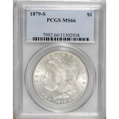 <B>1879-S $1 MS66 PCGS.</B></I> PCGS Population (5559/1085). NGC Census: (5246/1586). Mintage: 9,110,000. Numismedia Wsl. Price: $250. (#7092)<BR><BR><b>Shipping:</b> Coins & Currency (<a target="_blank" href="http://www.heritageauctions.com/common/shipping.php">view shipping information</a>)