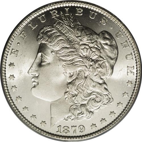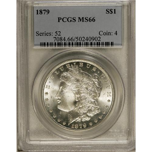 <B>1879 S$1 MS66 PCGS.</B></I> The 1879 Morgan dollar is quite plentiful in AU and the lower grades of Mint State, but becomes scarce in MS65, and quite scarce in Premium Gem. Higher-grade specimens are rare. This MS66 coin displays dazzling luster exuding from white surfaces. Generally well impressed, with no marks worthy of individual mention. Population: 72 in 66, 1 finer (10/06).<BR><BR><b>Shipping:</b> Coin/Currency (<a target="_blank" href="http://www.heritageauctions.com/common/shipping.php">view shipping information</a>)