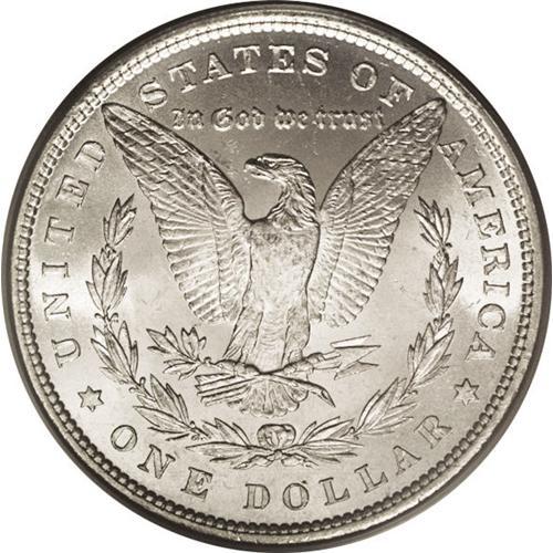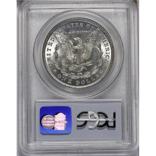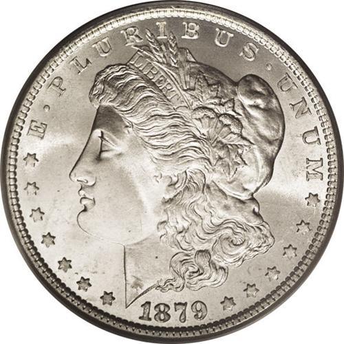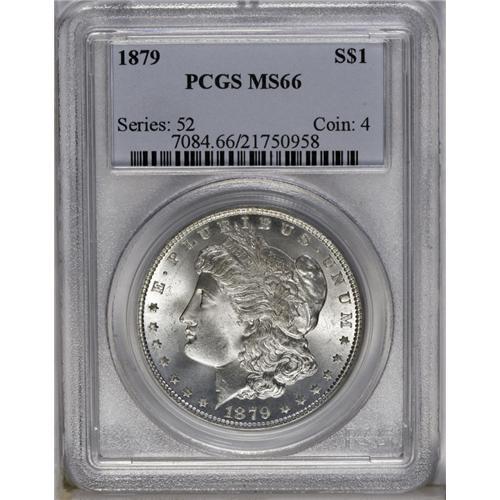 <B>1879<img border='0' src='http://www.heritagecoins.com/images/star.gif' width=10 height=10>$1> MS66 PCGS.</B></I> The 1879 is a significant condition rarity at the present level, this despite a sizeable original mintage of 14.8 million pieces. While many examples of this date were struck from improperly spaced dies, this coin is bold-to-sharp in all areas; the definition over the central highpoints is particularly impressive. Sparkling mint frost is readily evident in the absence of toning and bothersome abrasions. Population: 69 in 66; only one is finer (6/06).<BR><I>From The Chicago-Ark Collection.</B></I>