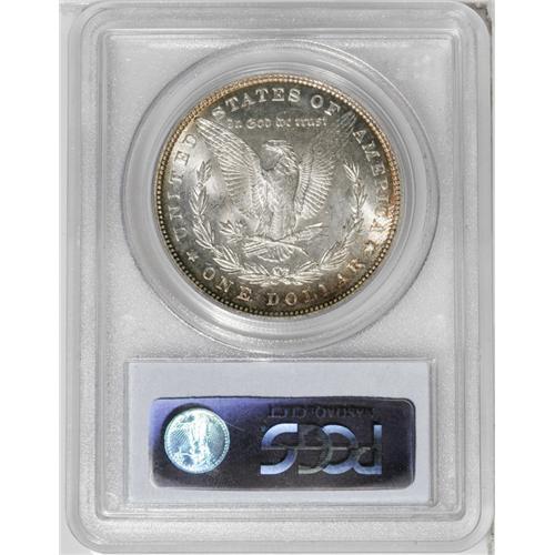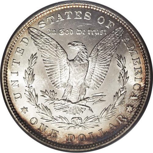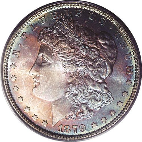 <B>1879<img border='0' src='http://www.heritagecoins.com/images/star.gif' width=10 height=10>$1> MS66 PCGS.</B></I> The reverse has red and violet toning in a thin crescent, a faint echo of the blooming blue-violet, orange-red, and yellow patina of the obverse, complemented by coruscating luster. Nicely detailed for this issue and quite appealing. PCGS has certified only one example finer (7/06).