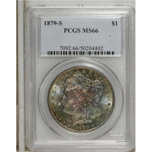 <B>1879-S $1 MS66 PCGS.</B></I> Gorgeous aqua-blue patina dominates each side of this highly lustrous Premium Gem example. Varying shades of deep crimson and gold are also seen on each side. A wonderful second-year piece for the toning enthusiast.<BR><BR><b>Shipping:</b> Coins & Currency (<a target="_blank" href="http://www.heritageauctions.com/common/shipping.php">view shipping information</a>)