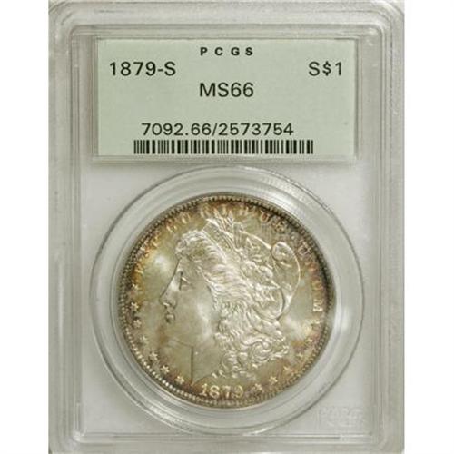 <B>1879-S $1 MS66 PCGS.</B></I> PCGS Population (5553/1086). NGC Census: (5406/1686). Mintage: 9,110,000. Numismedia Wsl. Price for NGC/PCGS coin in MS66: $248. (#7092)<BR><BR><B>Coin Engraver:</B> George T. Morgan<BR><BR><b>Shipping:</b> Coins & Currency (<a target="_blank" href="http://www.heritageauctions.com/common/shipping.php">view shipping information</a>\)