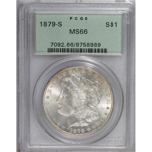 <B>1879-S $1 MS66 PCGS.</B></I> PCGS Population (5641/1116). NGC Census: (5450/1724). Mintage: 9,110,000. Numismedia Wsl. Price for NGC/PCGS coin in MS66: $240. (#7092)<BR><BR><B>Coin Engraver:</B> George T. Morgan<BR><BR><b>Shipping:</b> Coins & Currency (<a target="_blank" href="http://www.heritageauctions.com/common/shipping.php">view shipping information</a>)