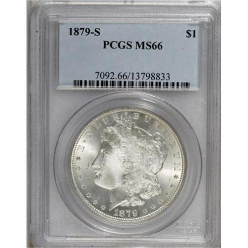<B>1879-S $1 MS66 PCGS.</B></I> PCGS Population (5649/1116). NGC Census: (5450/1724). Mintage: 9,110,000. Numismedia Wsl. Price for NGC/PCGS coin in MS66: $240. (#7092)<BR><BR><B>Coin Engraver:</B> George T. Morgan<BR><BR><b>Shipping:</b> Coins & Currency (<a target="_blank" href="http://www.heritageauctions.com/common/shipping.php">view shipping information</a>)