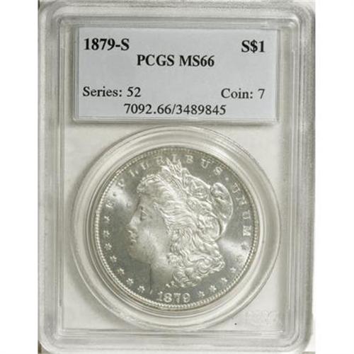 <B>1879-S $1 MS66 PCGS.</B></I> PCGS Population (5657/1128). NGC Census: (5450/1724). Mintage: 9,110,000. Numismedia Wsl. Price for NGC/PCGS coin in MS66: $240. (#7092)<BR><BR><B>Coin Engraver:</B> George T. Morgan<BR><BR><b>Shipping:</b> Coins & Currency (<a target="_blank" href="http://www.heritageauctions.com/common/shipping.php">view shipping information</a>)