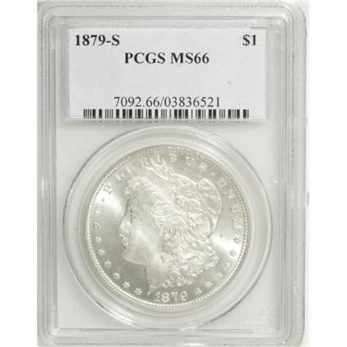 <B>1879-S $1 MS66 PCGS.</B></I> PCGS Population (5657/1128). NGC Census: (5450/1724). Mintage: 9,110,000. Numismedia Wsl. Price for NGC/PCGS coin in MS66: $240. (#7092)<BR><BR><B>Coin Engraver:</B> George T. Morgan<BR><BR><b>Shipping:</b> Coins & Currency (<a target="_blank" href="http://www.heritageauctions.com/common/shipping.php">view shipping information</a>)