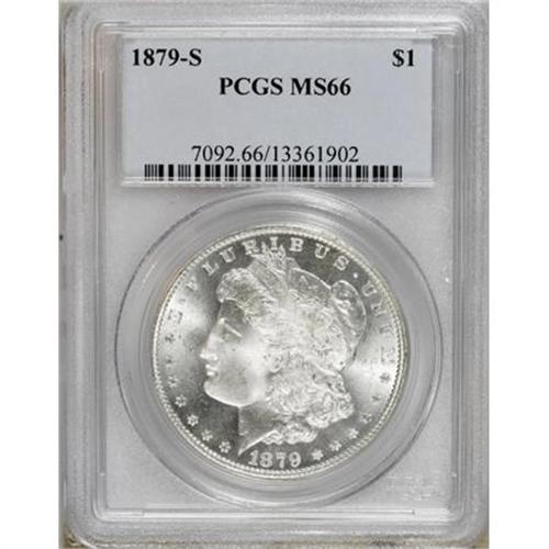 <B>1879-S $1 MS66 PCGS.</B></I> PCGS Population (5685/1131). NGC Census: (5513/1767). Mintage: 9,110,000. Numismedia Wsl. Price for NGC/PCGS coin in MS66: $240. (#7092)<BR><BR><B>Coin Engraver:</B> George T. Morgan<BR><BR><b>Shipping:</b> Coins & Currency (<a target="_blank" href="http://www.heritageauctions.com/common/shipping.php">view shipping information</a>)