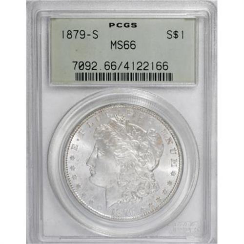 <B>1879-S $1 MS66 PCGS.</B></I> . PCGS Population (5698/1134). NGC Census: (5547/1783). Mintage: 9,110,000. Numismedia Wsl. Price for NGC/PCGS coin in MS66: $240. (#7092)<BR><BR><B>Coin Engraver:</B> George T. Morgan<BR><BR><b>Shipping:</b> Coins & Currency (<a target="_blank" href="http://www.heritageauctions.com/common/shipping.php">view shipping information</a>)