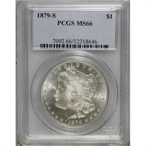 <B>1879-S $1 MS66 PCGS.</B></I> PCGS Population (5729/1150). NGC Census: (5556/1788). Mintage: 9,110,000. Numismedia Wsl. Price for NGC/PCGS coin in MS66: $240. (#7092)<BR><BR><B>Coin Engraver:</B> George T. Morgan<BR><BR><b>Shipping:</b> Coins & Currency (<a target="_blank" href="http://www.heritageauctions.com/common/shipping.php">view shipping information</a>)