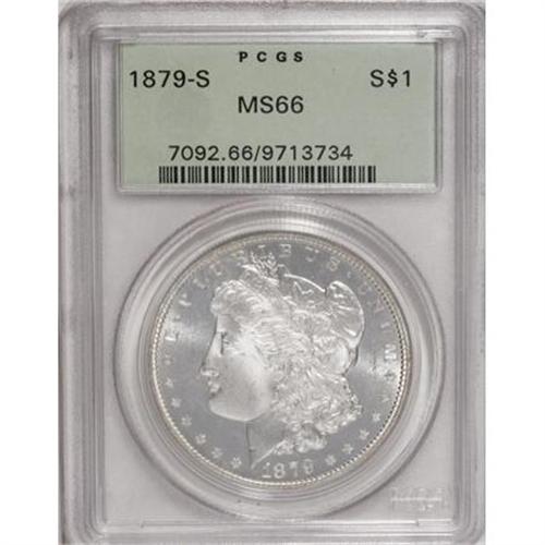 <B>1879-S $1 MS66 PCGS.</B></I> PCGS Population (5725/1150). NGC Census: (5550/1785). Mintage: 9,110,000. Numismedia Wsl. Price for NGC/PCGS coin in MS66: $240. (#7092)<BR><BR><B>Coin Engraver:</B> George T. Morgan<BR><BR><b>Shipping:</b> Coins & Currency (<a target="_blank" href="http://www.heritageauctions.com/common/shipping.php">view shipping information</a>)