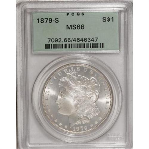 <B>1879-S $1 MS66 PCGS.</B></I> PCGS Population (5725/1150). NGC Census: (5550/1785). Mintage: 9,110,000. Numismedia Wsl. Price for NGC/PCGS coin in MS66: $240. (#7092)<BR><BR><B>Coin Engraver:</B> George T. Morgan<BR><BR><b>Shipping:</b> Coins & Currency (<a target="_blank" href="http://www.heritageauctions.com/common/shipping.php">view shipping information</a>)