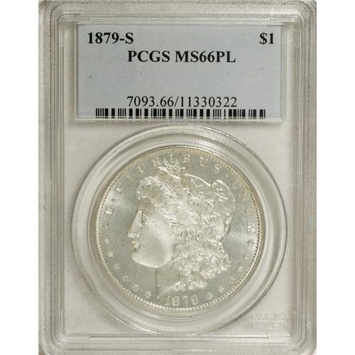 <B>1879-S $1 MS66 Prooflike PCGS.</B></I> PCGS Population (277/42). NGC Census: (289/72). Numismedia Wsl. Price: $436. (#7093)<BR><BR><b>Shipping:</b> Coins & Currency (<a target="_blank" href="http://www.heritageauctions.com/common/shipping.php">view shipping information</a>)