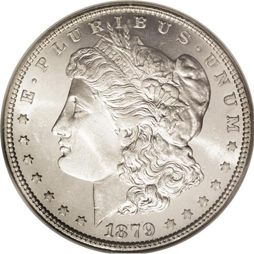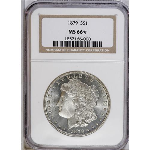 <B>1879<img border='0' src='http://www.heritagecoins.com/images/star.gif' width=10 height=10>$1> MS66 <img border='0' src='http://www.heritagecoins.com/images/star.gif' width=10 height=10> NGC.</B></I> Flashy luster and the absence of relevant marks assert the eye appeal of this nearly stone-white high grade silver dollar. Well impressed except for slight incompleteness in the centers. Although unheralded, the 1879 Morgan dollar is many times scarcer than the 1879-S in Gem and finer grades. Census: 2 in 66 <img border='0' src='http://www.heritagecoins.com/images/star.gif' width=10 height=10>, none finer with a Star designation (7/06).