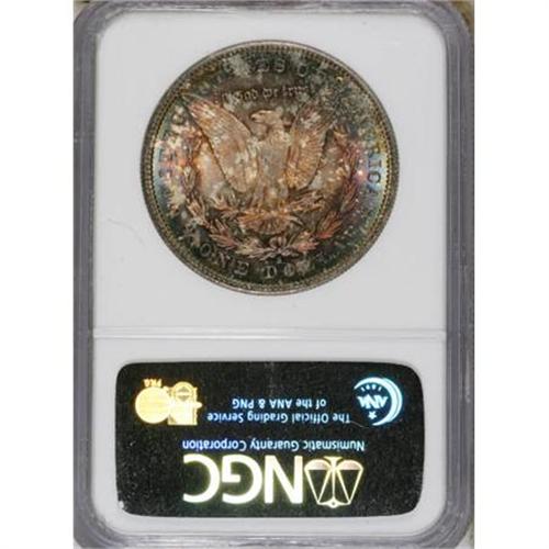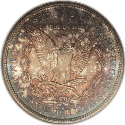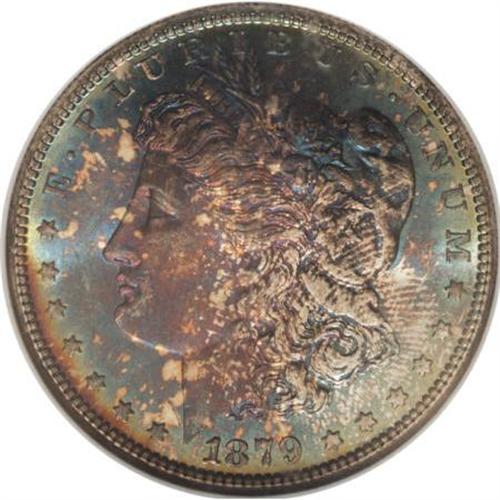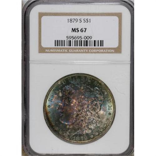 <B>1879-S $1 MS67 NGC.</B></I> An amazing Superb Gem with dramatically toned obverse and reverse surfaces over satiny luster. Both sides have crimson, cobalt, and iridescent toning, with additional gold color on the reverse. The strike is intricate, as usual for the well made '79-S.<BR><BR><b>Shipping:</b> Coins & Currency (<a target="_blank" href="http://www.heritageauctions.com/common/shipping.php">view shipping information</a>)