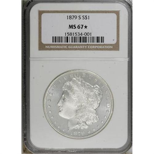 <B>1879-S $1 MS67 <img border='0' src='http://www.heritagecoins.com/images/star.gif' width=10 height=10> NGC.</B></I> This beautiful stone-white Superb Gem has semi-prooflike fields and an intricate strike. An exceptional silver type coin. A small planchet flaw (as produced) is present above star 10.<BR><BR><b>Shipping:</b> Coins & Currency (<a target="_blank" href="http://www.heritageauctions.com/common/shipping.php">view shipping information</a>)
