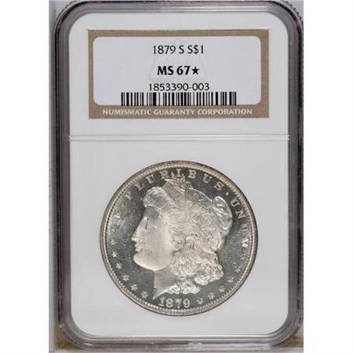<B>1879-S $1 MS67</B></I> S<B> NGC.</B></I> The obverse is rather prooflike, which no doubt inspired the Star designation from NGC. The reverse is merely semi-prooflike. A brilliant and beautiful Superb Gem that has the penetrating strike usual for the '79-S. The mintmark is slightly repunched.<BR><BR><b>Shipping:</b> Coins & Currency (<a target="_blank" href="http://www.heritageauctions.com/common/shipping.php">view shipping information</a>)