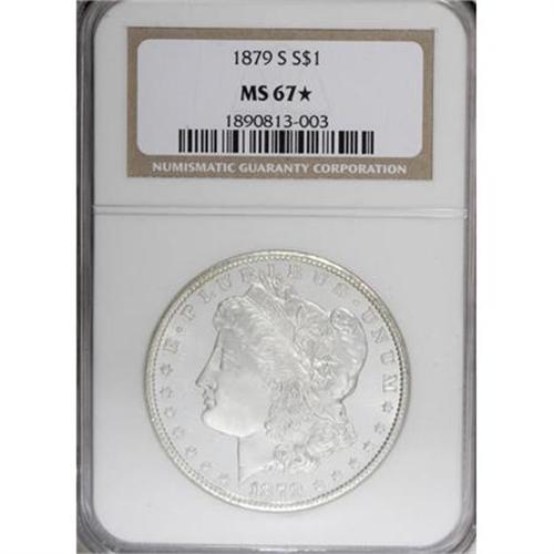 <B>1879-S $1 MS67 <img src="/images/star.gif" width="10" height="10" alt="" border="0"> NGC.</B></I> The obverse is a cameo deep mirror prooflike, hence the Star designation from NGC. The reverse is merely semi-prooflike. A brilliant and needle-sharp Superb Gem with a few inconsequential grazes on the cheek.<BR><BR><B>Coin Engraver:</B> George T. Morgan<BR><BR><b>Shipping:</b> Coins & Currency (<a target="_blank" href="http://www.heritageauctions.com/common/shipping.php">view shipping information</a>)