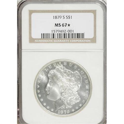 <B>1879-S $1 MS67 </B></I><img src="/images/star.gif" width="10" height="10" alt="" border="0"><B> NGC.</B></I> A remarkable Superb Gem with fully brilliant silver surfaces. The obverse is satiny with prooflike fields, and the reverse is entirely frosty. A remarkable piece destined for a world-class date or type collection.<BR><BR><B>Coin Engraver:</B> George T. Morgan<BR><BR><b>Shipping:</b> Coins & Currency (<a target="_blank" href="http://www.heritageauctions.com/common/shipping.php">view shipping information</a>)