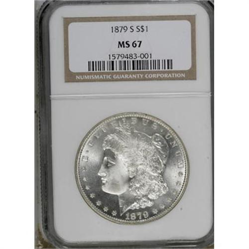 <B>1879-S $1 MS67 NGC.</B></I> This is a lovely Superb Gem silver dollar with utterly brilliant, snow-white surfaces that are astonishingly clean and essentially immaculate. Few Morgan dollars of any date can boast such impressive preservation. The design elements are well produced. <BR><BR><B>Coin Engraver:</B> George T. Morgan<BR><BR><b>Shipping:</b> Coins & Currency (<a target="_blank" href="http://www.heritageauctions.com/common/shipping.php">view shipping information</a>)