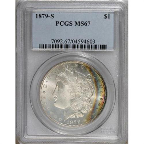 <B>1879-S $1 MS67 PCGS.</B></I> Part of the allure of this Superb coin are the clean, bright, lustrous surfaces. The other part is the long arc of rainbow iridescence on the right side of the obverse. Exceptional quality and visual appeal.<BR><BR><b>Shipping:</b> Coins & Currency (<a target="_blank" href="http://www.heritageauctions.com/common/shipping.php">view shipping information</a>)