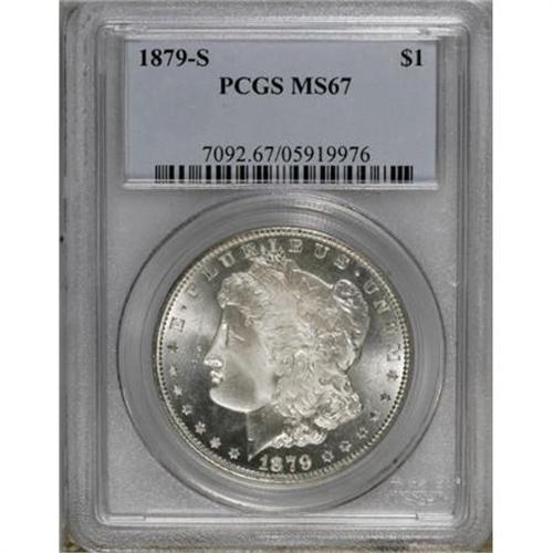 <B>1879-S $1 MS67 PCGS.</B></I> This flashy example approaches the Prooflike category, with watery fields that show north-to-south striations on each side. Essentially untoned, with a few faint marks that fail to limit the grade. <BR><BR><B>Coin Engraver:</B> George T. Morgan<BR><BR><b>Shipping:</b> Coins & Currency (<a target="_blank" href="http://www.heritageauctions.com/common/shipping.php">view shipping information</a>)