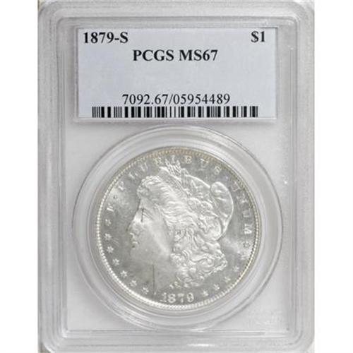 <B>1879-S $1 MS67 PCGS.</B></I> Frosty motifs stand out against the semi-prooflike fields, and exhibit strong definition. Untoned surfaces yield impeccable preservation.<BR><I>From The Silver Spur Collection of Morgan Dollars.</B></I><BR><BR><B>Coin Engraver:</B> George T. Morgan<BR><BR><b>Shipping:</b> Coins & Currency (<a target="_blank" href="http://www.heritageauctions.com/common/shipping.php">view shipping information</a>)
