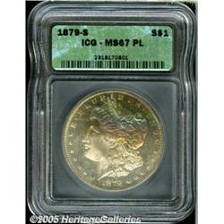 <B>1879-S<img border='0' src='http://www.heritagecoins.com/images/star.gif' width=10 height=10>$1 MS67 Prooflike ICG.</B></I> A swath of pretty multicolored toning covers the upper half of the obverse, and golden-orange color is noted around the lower reverse margin. The design elements are sharply struck throughout. One tiny mark is visible on Liberty's cheek.