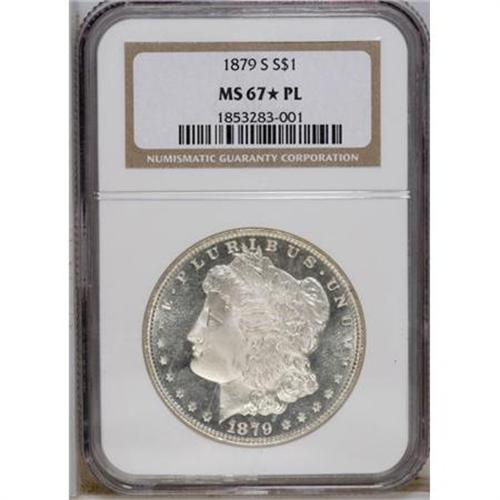 <B>1879-S $1 MS67 </B></I> S<B> Prooflike NGC.</B></I> The obverse reflectivity is exceptional, though the reverse is "merely" Prooflike. Slightly hazy with strong detail on the portrait, which has a blush of rose. Fully struck and exceptionally well preserved. <BR><BR><b>Shipping:</b> Coins & Currency (<a target="_blank" href="http://www.heritageauctions.com/common/shipping.php">view shipping information</a>)