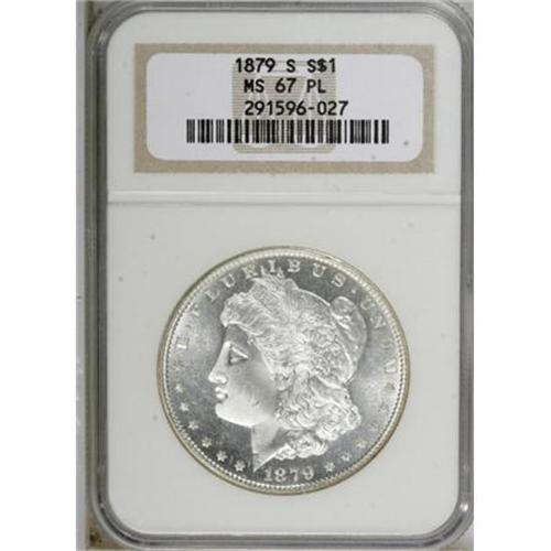 <B>1879-S $1 MS67 Prooflike NGC.</B></I> An amazing piece with bright silver surfaces. The fields are fully mirrored with lustrous devices and excellent cameo contrast. Census: 69 in 67 Prooflike, 4 finer (10/07).<BR><BR><B>Coin Engraver:</B> George T. Morgan<BR><BR><b>Shipping:</b> Coins & Currency (<a target="_blank" href="http://www.heritageauctions.com/common/shipping.php">view shipping information</a>)