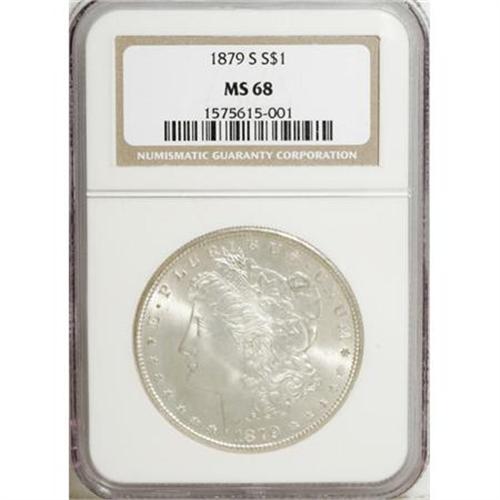 <B>1879-S $1 MS68 NGC.</B></I> The 1879-S has a reputation as one of the best produced issues in the Morgan dollar series and, fortunately for today's collector, countless bags of Mint State pieces were spared from both circulation and mass melting. This elite survivor displays creamy, razor sharp surfaces and, more importantly, shows almost no signs of coin-to-coin contact.<BR><BR><B>Coin Engraver:</B> George T. Morgan<BR><BR><b>Shipping:</b> Coins & Currency (<a target="_blank" href="http://www.heritageauctions.com/common/shipping.php">view shipping information</a>\)
