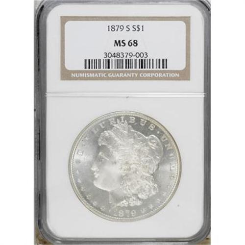 <B>1879-S $1 MS68 NGC.</B></I> This magnificent silver type coin has an essentially pristine reverse, and the obverse is also impressively close to as made. Even the cheek and obverse field are bereft of contact. A whisper of gold toning denies full brilliance. The 1879-S is plentiful in Mint State, but only example out of thousands can compare with the present exemplary Superb Gem.<BR><BR><B>Coin Engraver:</B> George T. Morgan<BR><BR><b>Shipping:</b> Coins & Currency (<a target="_blank" href="http://www.heritageauctions.com/common/shipping.php">view shipping information</a>)