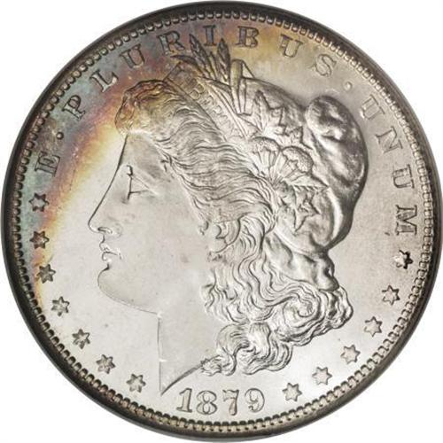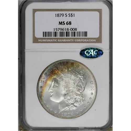 <B>1879-S $1 MS68 NGC. CAC.</B></I> The "3rd Reverse" variety, with the slanting top arrow feather. An arc of cobalt-blue, lavender, and yellow-gold patination hugs the upper left obverse border, leaving the remaining surfaces brilliant. A solid strike imparts excellent detail to the design features, and both sides are immaculately preserved.<BR><BR><B>Coin Engraver:</B> George T. Morgan<BR><BR><b>Shipping:</b> Coins & Currency (<a target="_blank" href="http://www.heritageauctions.com/common/shipping.php">view shipping information</a>)