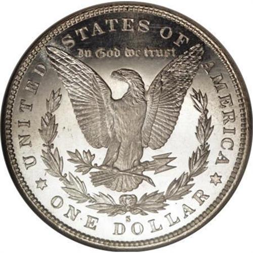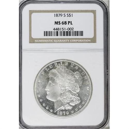 <B>1879-S $1 MS68 Prooflike NGC.</B></I> The pristine, silvery surfaces are essentially untouched on either side. The fields are deep pools of limpid reflectivity, while the devices display a considerable layer of thick mint frost. The strike is nearly full, except for the few faint roller marks seen in the hair over Liberty's ear, which affect neither the grade nor the aesthetics. This piece is one of just four coins so graded by NGC, with none finer (3/08).<BR><BR><B>Coin Engraver:</B> George T. Morgan<BR><BR><b>Shipping:</b> Coins & Currency (<a target="_blank" href="http://www.heritageauctions.com/common/shipping.php">view shipping information</a>)