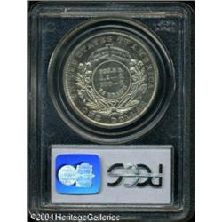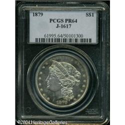 1879 S$1 Metric Dollar, Judd-1617, Pollock-1813, R.4 <B>1879 S$1 Metric Dollar, Judd-1617, Pollock-1813, R.4, PR64 PCGS.</B></I> William Barber's Metric Dollar with Liberty wearing a coronet with a border of pearls. The reverse is quite elaborate with a partial wreath of cotton and corn tied at the base, a ribbon, and with DEO EST GLORIA on a tablet above. Struck in silver with a reeded edge. This is an attractive proof example with mottled champagne, russet, and blue toning at selected border areas. The Metric Dollars are seldom found with this degree of eye appeal. Most have been cleaned or otherwise mistreated. Few finer examples of this issue have been certified, despite its status as a relatively plentiful pattern issue. <BR><BR><B>Important notice:</B> Heritage usually auctions material at the rate of 200-250 lots per hour. On some occasions eBay Live bid software or the Internet may not be able to keep up with the pace of the auction. We recommend placing a realistic absentee bid now as insurance to avoid disappointment. Occasionally the auctioneer may eliminate or reject an eBay Live bid, and the auctioneer may also reopen a lot after the close of the eBay live bidding (usually because we missed an audience bid), and may reject your bid even if it shows you as the winning bidder. By bidding via eBay Live, you agree that Heritage may award the lot to another bidder at its sole discretion under the circumstances described above or any other reasonable circumstances. Since eBay bids are not shown to us until we open the lot on the floor, we treat those bids just like floor bids. In most cases the floor responds before the eBay bid is presented to us, due to Internet lag time, so for consistency we have made it a policy that floor bids are always considered first over tie eBay live bids. Also please note that all Heritage lots purchased through eBay Live carry a 20% Buyer's Premium. Please make sure you read the Terms and Conditions before you bid. This lot is being auctioned in conjunction with a live floor auction by Heritage Galleries & Auctioneers. All final auction and invoice information will be supplied by Heritage Galleries & Auctioneers, and all other information should be considered preliminary. Lot:6354
