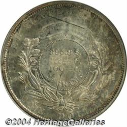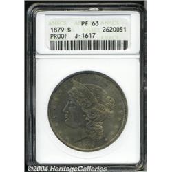 <B>1879<S$1> Metric Dollar, Judd-1617, Pollock-1813, R.4, PR63 ANACS.</B></I> William Barber's Metric Dollar with Liberty wearing a coronet with a border of pearls. The reverse is quite elaborate with a partial wreath of cotton and corn tied at the base, a ribbon, and with DEO EST GLORIA on a tablet above. Struck in silver with a reeded edge. Golden-brown and ocean-blue patina endows this well struck and undisturbed specimen. <BR><BR><B>Important notice:</B> Heritage usually auctions material at the rate of 200-250 lots per hour. On some occasions eBay Live bid software or the Internet may not be able to keep up with the pace of the auction. We recommend placing a realistic absentee bid now as insurance to avoid disappointment. Occasionally the auctioneer may eliminate or reject an eBay Live bid, and the auctioneer may also reopen a lot after the close of the eBay live bidding (usually because we missed an audience bid), and may reject your bid even if it shows you as the winning bidder. By bidding via eBay Live, you agree that Heritage may award the lot to another bidder at its sole discretion under the circumstances described above or any other reasonable circumstances. Since eBay bids are not shown to us until we open the lot on the floor, we treat those bids just like floor bids. In most cases the floor responds before the eBay bid is presented to us, due to Internet lag time, so for consistency we have made it a policy that floor bids are always considered first over tie eBay live bids. Also please note that all Heritage lots purchased through eBay Live carry a 20% Buyer's Premium. Please make sure you read the Terms and Conditions before you bid. </span></font></tr></table></td></tr></table>