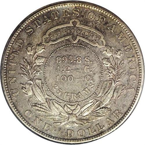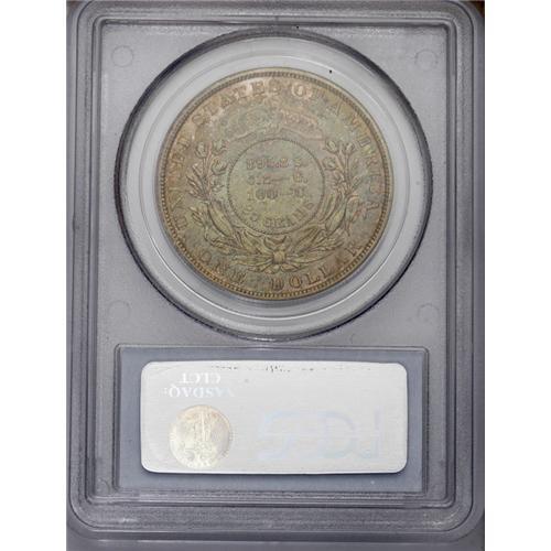 <B>1879<img border='0' src='http://www.heritagecoins.com/images/star.gif' width=10 height=10>$1 Metric Dollar, Judd-1617, Pollock-1813, R.4, PR63 PCGS.</B></I> William Barber's Metric dollar with Liberty wearing a coronet with a border of pearls. The reverse is quite elaborate with a partial wreath of cotton and corn tied at the base, a ribbon, and with DEO EST GLORIA on a tablet above. Struck in silver (or goloid) with a reeded edge. Mottled olive-gray and steel-violet toning cloaks the somewhat drab obverse, while forest-green and orange hues are seen across the reverse.