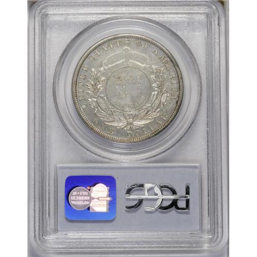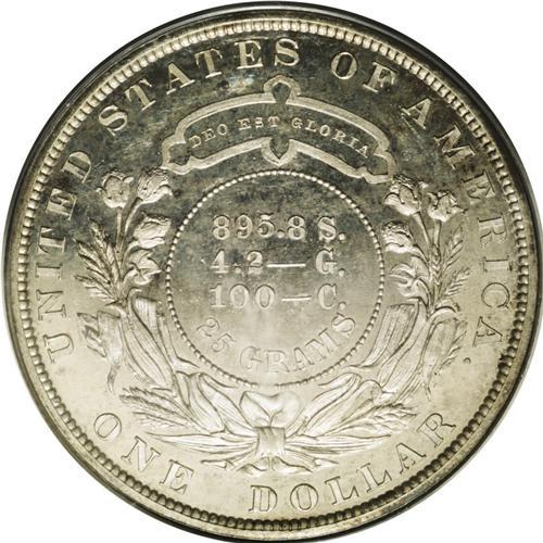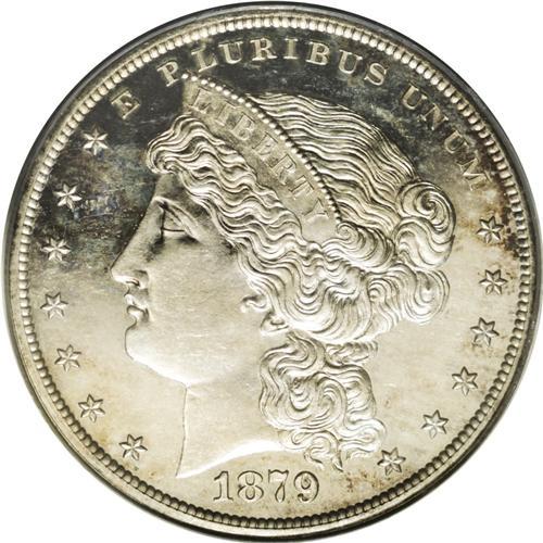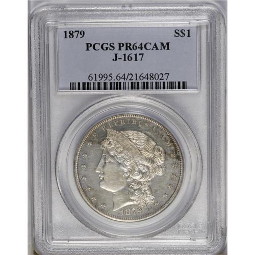<B>1879<img border='0' src='http://www.heritagecoins.com/images/star.gif' width=10 height=10>$1> Metric Dollar, Judd-1617, Pollock-1813, R.4, PR64 Cameo PCGS.</B></I> This is a splendid Cameo proof with pale champagne and iridescent toning over mirrored fields and lustrous devices. The Metric dollars are seldom found with this degree of eye appeal. Most have been cleaned or otherwise mistreated. Few finer examples of this issue have been certified, despite its status as a relatively plentiful pattern issue. Population: 12 in 64, 10 finer (6/06).