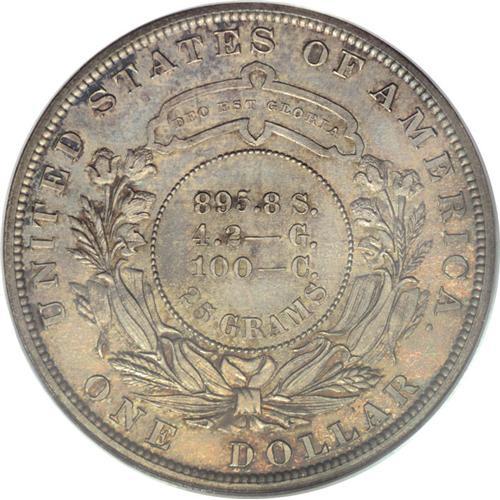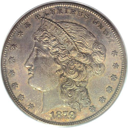 <B>1879 S$1 Metric Dollar, Judd-1617, Pollock-1813, R.4, PR65 PCGS.</B></I> The Mint hired William Barber in 1865 as assistant engraver. Four years later James B. Longacre died, on Jan. 1, 1869, and Barber was named chief engraver. This design is from the year that William Barber himself died, and it is a derivative work on both sides. The obverse, showing Liberty wearing a coronet with a border of pearls, in many of its details is more than a little reminiscent of the Morgan dollar obverse. The elaborate reverse, with a partial wreath of cotton and corn tied at the base, a ribbon, and DEO EST GLORIA on a cartouche above, recalls elements of the Gobrecht Liberty Seated half dime and dime reverse design, introduced in 1860, as well as the Longacre Liberty Head With Motto reverse, introduced in 1866. The central reverse denotes the odd metal composition known as "goloid" that comprises the weight of exactly 25 gm metric. Reeded edge. This piece shows muted luster with deep sunset-orange and charcoal-gray patina on each side, but there are few surface impairments of any kind noted, even under a loupe. Certified in a green-label holder. Population: 9 in 65, 1 finer (3/07).<BR><BR><b>Shipping:</b> Coins & Currency (<a target="_blank" href="http://www.heritageauctions.com/common/shipping.php">view shipping information</a>)