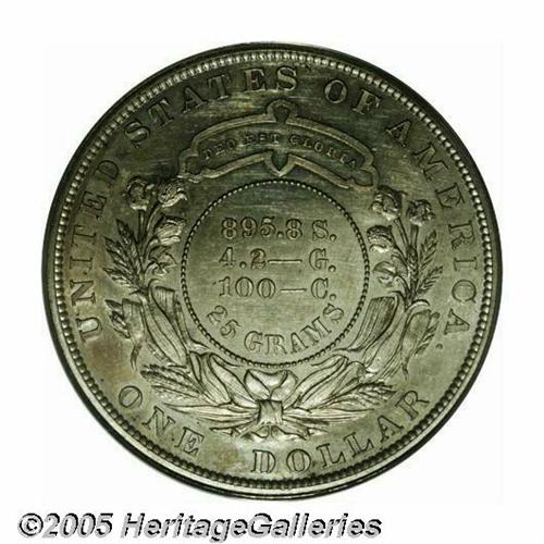 <B>1879<S$1> Metric Dollar, Judd-1617, Pollock-1813, R.4, PR62 PCGS.</B></I> This Metric dollar design features Liberty wearing a coronet with a border of pearls, and it is similar to the design used on the 1877 $50 half union patterns. Allegedly designed by William Barber, this may have actually been executed by his son Charles. The reverse is quite elaborate with a partial wreath of cotton and corn tied at the base, a ribbon, and with DEO EST GLORIA on a tablet above. Struck in silver (or goloid) with a reeded edge. Lightly hairlined, the deeply reflective surfaces are toned a pleasing golden and lilac over each side.