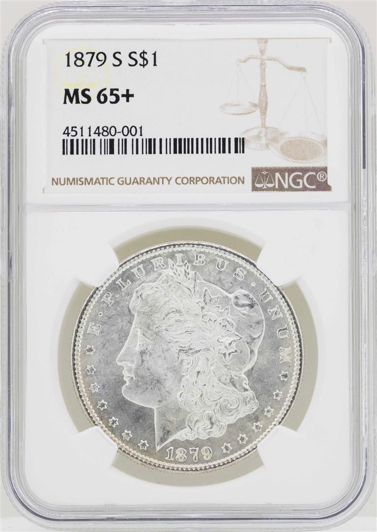 One 1879-S $1 Morgan Silver Dollar Coin NGC MS65+. NGC Certified.