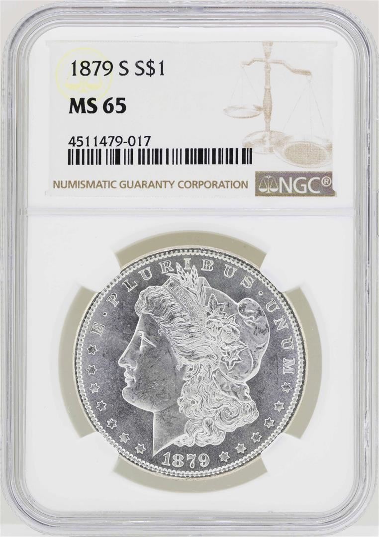 One 1879-S $1 Morgan Silver Dollar Coin NGC MS65. NGC Certified.