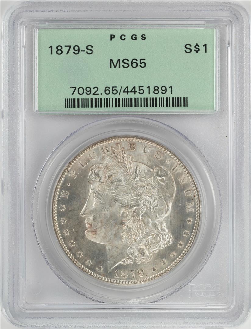 One 1879-S $1 Morgan Silver Dollar Coin PCGS MS65 OGH. PCGS Graded.