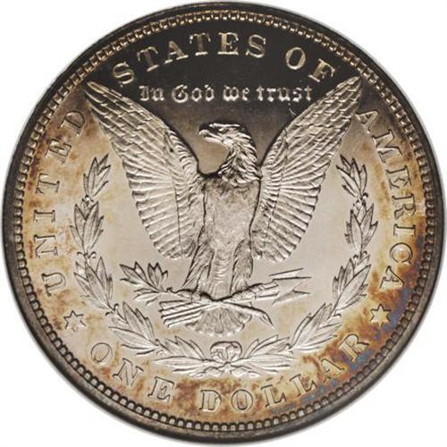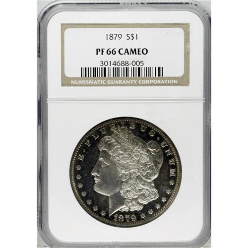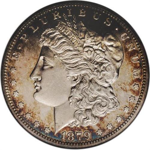 <B>1879 S$1 PR66 Cameo NGC.</B></I> Silver centers with a slight golden cast and thick mint frost on the devices contrast well with the mirrored fields that feature iridescent russet and blue toning near the rims. The exacting strike is matched is equalled by the meticulous subsequent state of preservation. Census: 14 in 66, 15 finer (1/07).<BR><BR><b>Shipping:</b> Coins & Currency (<a target="_blank" href="http://www.heritageauctions.com/common/shipping.php">view shipping information</a>)