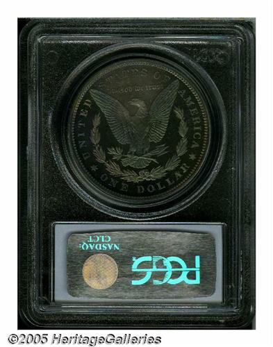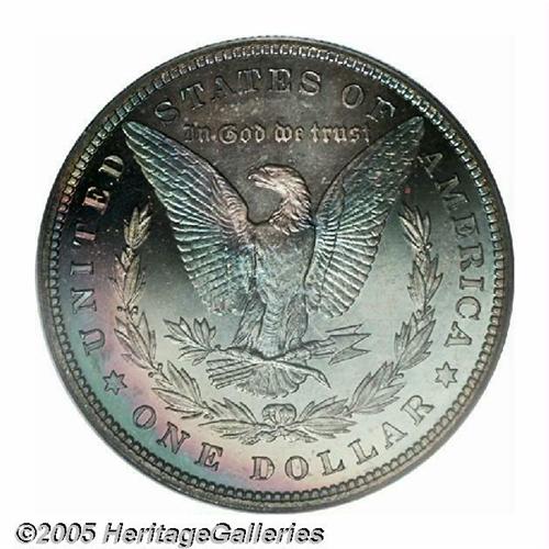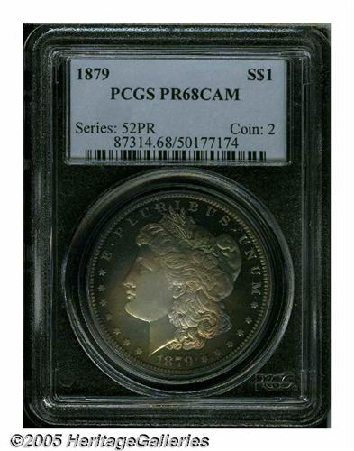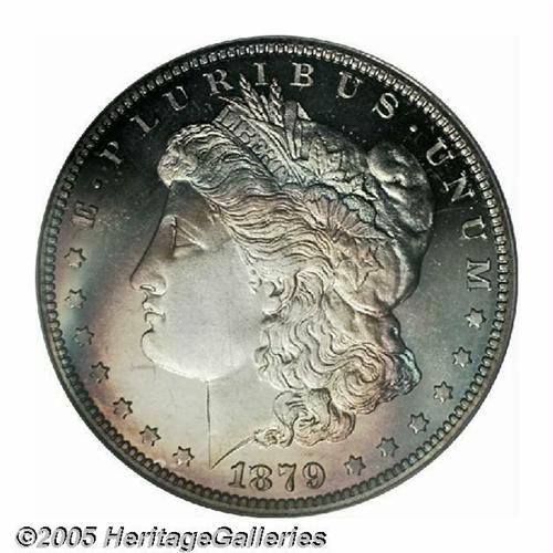 <B>1879<S$1> PR68 Cameo PCGS.</B></I> Some difference of opinion exists about the actual production of proofs this year. Mint records indicate 1,100 were struck, but Breen differs with this figure suggesting that just 650 proofs were produced; 250 struck in the first quarter, 500 in the second, for a total of 750, 100 of which were melted as unsold. His research lends him to believe that 450 leftover 1878 examples were counted in with the Mint figure as they were on hand in January, 1879. Bowers, on the other hand, believes that fewer than 1,100 proofs may have been struck, but more than the 650 figure. This is one of the few remaining examples that has been properly cared for over the years and never cleaned as so many were. A wonderful toning scheme including purple-magenta and turquoise-blue is seen in a concentric fashion on each side. Hairline and mark-free, a remarkably attractive coin. Population at both services: 3 in 68 Cameo, 0 finer (1/05).