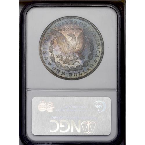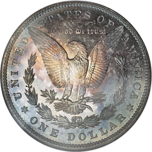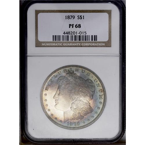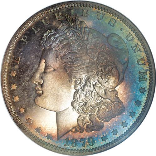 <B>1879<img border='0' src='http://www.heritagecoins.com/images/star.gif' width=10 height=10>$1> PR68 NGC.</B></I> The light champagne patina at the center of the obverse melds into iridescent electric blue, jade-green, and amber-gold at the rims, while the reverse features more liberal daubs of the same hues. Yet the luster remains blindingly brilliant, and close scrutiny with a loupe fails to reveal <I>any</B></I> mentionable defects, as expected, of any size, large or small. There are <I>no</B></I> visible hairlines. A single, tiny reverse lintmark is noted for pedigree purposes, below and left of the arrow feathers. Simply stunning, and approaching perfection. Both services together have certified a total of eight examples in PR68, with none finer (3/06). <BR><BR><B>Important notice:</B> Heritage usually auctions material at the rate of 200-250 lots per hour. On some occasions eBay Live bid software or the Internet may not be able to keep up with the pace of the auction. We recommend placing a realistic absentee bid now as insurance to avoid disappointment. Occasionally the auctioneer may eliminate or reject an eBay Live bid, and the auctioneer may also reopen a lot after the close of the eBay live bidding (usually because we missed an audience bid), and may reject your bid even if it shows you as the winning bidder. By bidding via eBay Live, you agree that Heritage may award the lot to another bidder at its sole discretion under the circumstances described above or any other reasonable circumstances. Since eBay bids are not shown to us until we open the lot on the floor, we treat those bids just like floor bids. In most cases the floor responds before the eBay bid is presented to us, due to Internet lag time, so for consistency we have made it a policy that floor bids are always considered first over tie eBay live bids. Also please note that all Heritage lots purchased through eBay Live carry a 20% Buyer's Premium. Please make sure you read the Terms and Conditions before you bid. This lot is being auctioned in conjunction with a live floor auction by Heritage Galleries & Auctioneers. All final auction and invoice information will be supplied by Heritage Galleries & Auctioneers, and all other information should be considered preliminary. Lot:3800 <BR><BR><B>Winning Notification and Billing:</B> After the FINAL session in this auction is complete, Heritage will send e-mail and snail mail invoices. This process normally takes several days. All final auction and invoice information will be supplied by Heritage Galleries & Auctioneers, and all other information should be considered preliminary. <BR><BR>This auction will be conducted on a live auction floor and over the Internet through eBay Live. If you choose to place an absentee bid, please take a moment to <font color='#0000ff'><u><a href='http://pages.ebay.com/liveauctions/help/before/laabsentee.html'>learn how eBay Live absentee bidding works</a></u></font><font color='#000000'>
