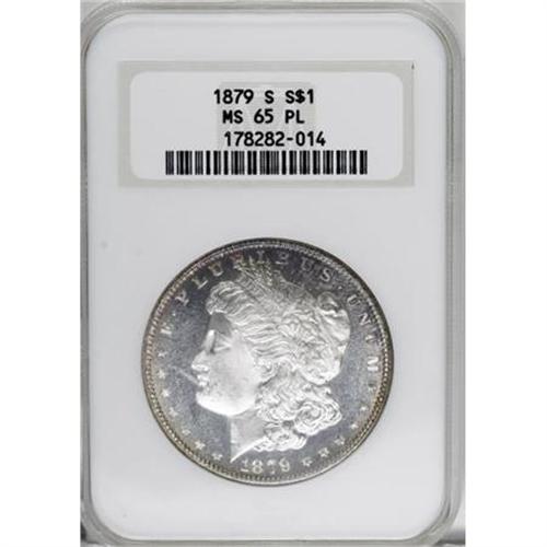 <B>1879-S $1 MS65 Prooflike NGC.</B></I> NGC Census: (984/369). PCGS Population (1035/315). Numismedia Wsl. Price for NGC/PCGS coin in MS65: $200. (#7093)<BR><BR><B>Coin Engraver:</B> George T. Morgan<BR><BR><b>Shipping:</b> Coins & Currency (<a target="_blank" href="http://www.heritageauctions.com/common/shipping.php">view shipping information</a>)