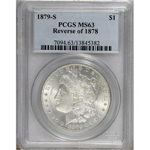 <B>1879-S $1 Reverse of 1878 MS63 PCGS.</B></I> PCGS Population (573/486). NGC Census: (357/266). Numismedia Wsl. Price for NGC/PCGS coin in MS63: $300. (#7094)<BR><BR><B>Coin Engraver:</B> George T. Morgan<BR><BR><b>Shipping:</b> Coins & Currency (<a target="_blank" href="http://www.heritageauctions.com/common/shipping.php">view shipping information</a>)